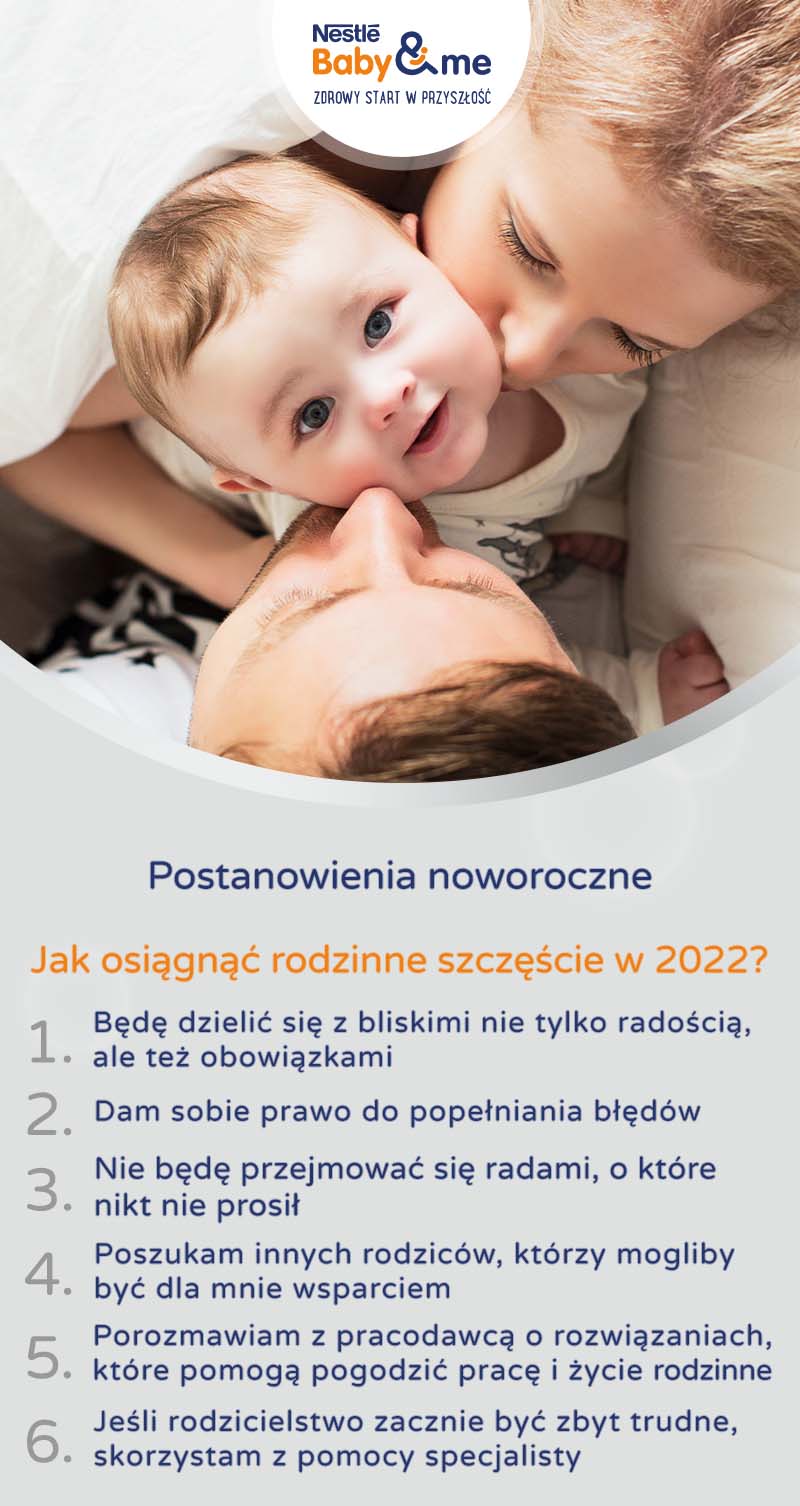 Początek nowego roku to zwykle czas podsumowań, ale też robienia planów na przyszłość. Dla rodziców może być to idealny moment, by przyjrzeć się wyzwaniom związanym z opieką nad maluchem i zastanowić się, jak chcą radzić sobie z nimi w następnych miesiącach. Szczęśliwy rodzic to szczęśliwe dziecko – oto propozycje, jak osiągnąć rodzinne szczęście w 2022.